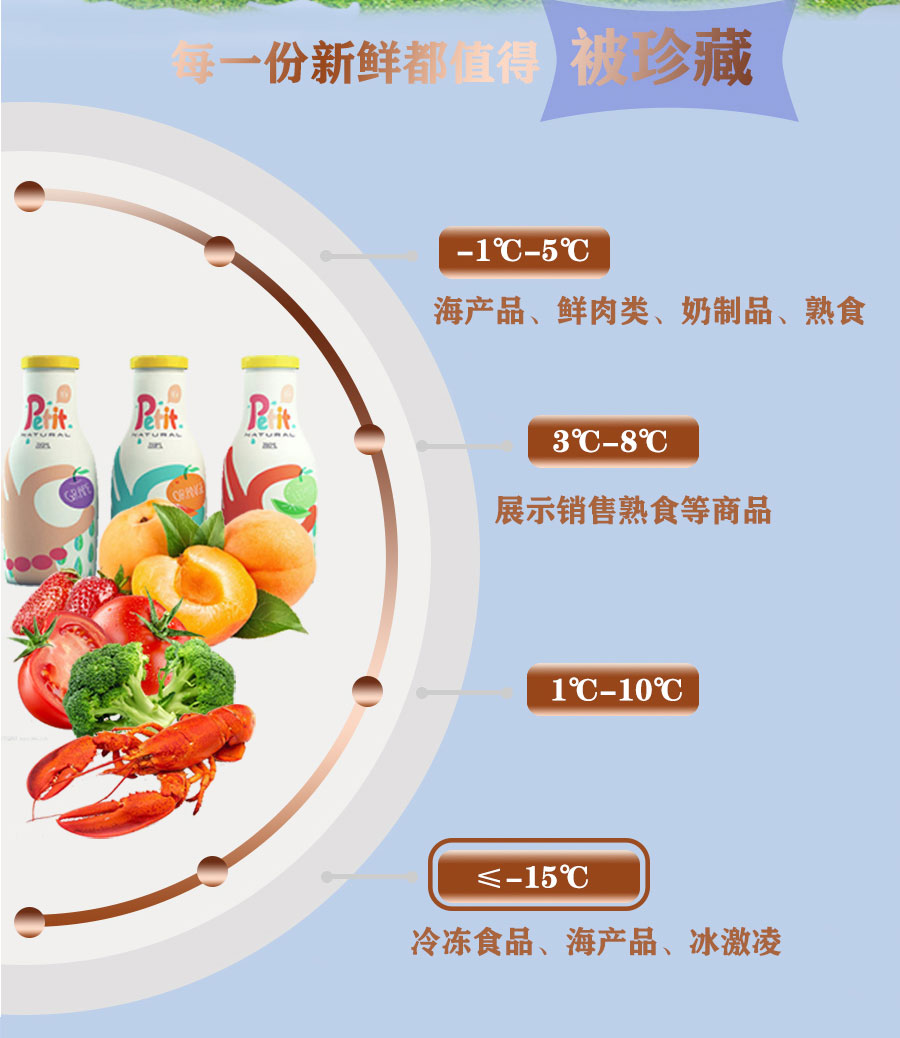 運行溫度為L1(<-15℃),用于展示和銷售各種肉制品、海產品、冰淇淋、速凍水餃等冷凍食品。