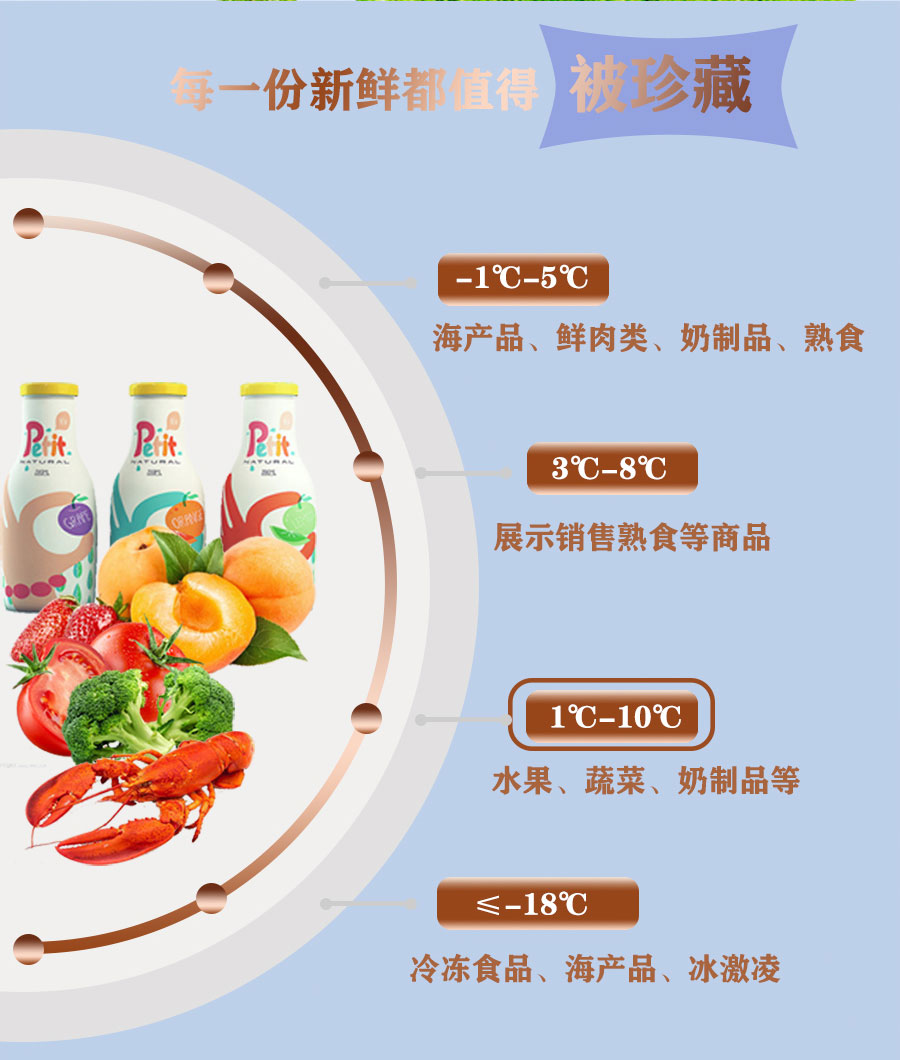 ★溫度范圍:H(1~10℃)用于倉儲展示和銷售各種水果、蔬菜、奶制品等食品。